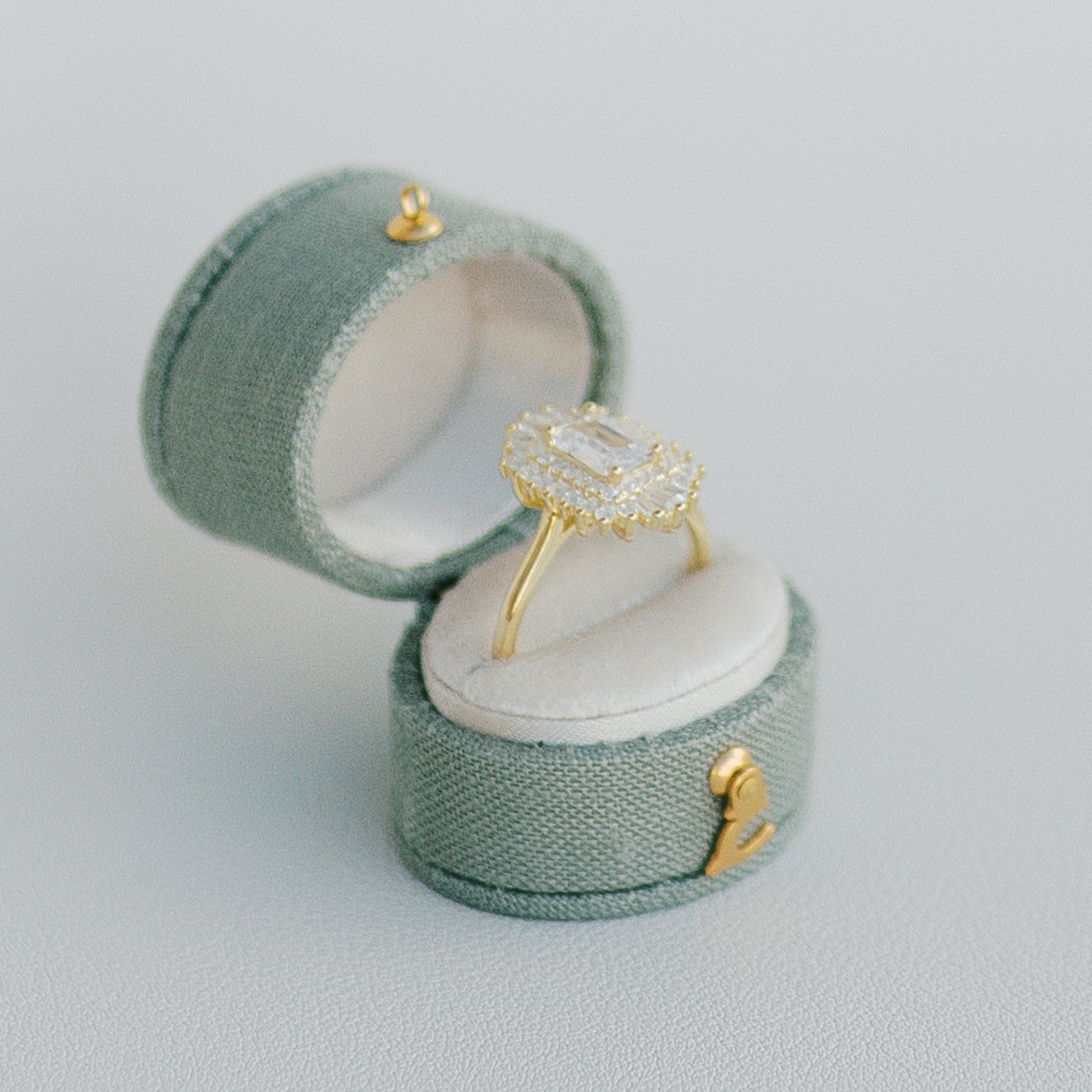 Introducing the Georgian Ring Box, a stunning homage to the classic Georgian design. Inspired by tradition, this oval-shaped beauty features an exterior crafted from fine linen, exuding timeless elegance. Open it to reveal a luxurious velvet cushion, meticulously designed to put all of the attention on your ring.