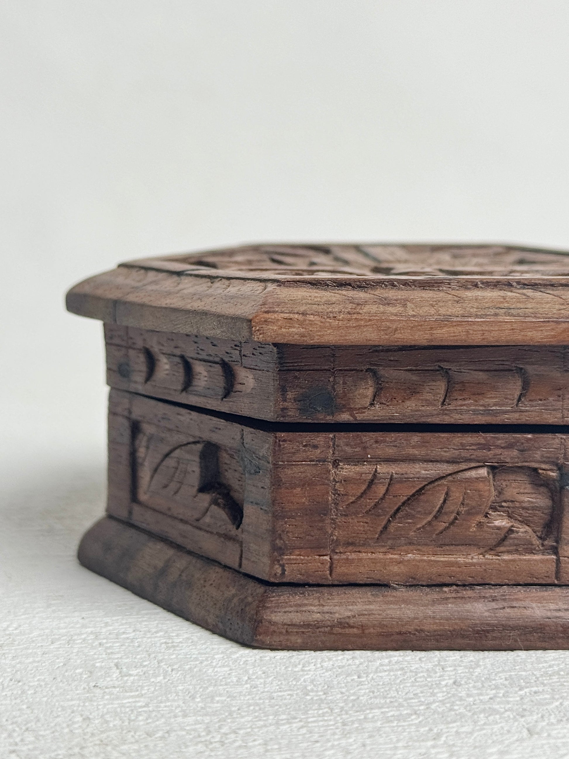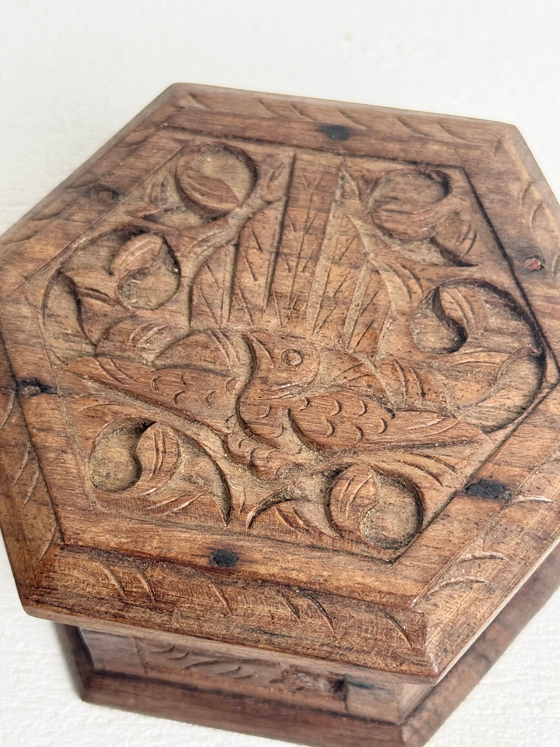 Vintage Carved Wood Hexagon Box, Ornate Hand Carved Bird Floral Trinket | Boho Jewelry